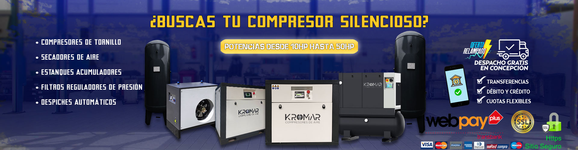 Leer más COMPRESOR DE TORNILLO SILENCIOSO 10HP Leer más COMPRESOR DE TORNILLO SILENCIOSO 15HP Leer más COMPRESOR DE TORNILLO SILENCIOSO 20HP Leer más COMPRESOR DE TORNILLO SILENCIOSO 30HP Leer más COMPRESOR DE TORNILLO SILENCIOSO 50HP Leer más COMPRESOR DE TORNILLO SILENCIOSO 10HP C/ESTANQUE ACUMULADOR 300L Leer más COMPRESOR DE TORNILLO SILENCIOSO 15HP C/ESTANQUE ACUMULADOR 500L Leer más COMPRESOR DE TORNILLO SILENCIOSO 20HP C/ESTANQUE ACUMULADOR 500L Leer más ESTANQUE ACUMULADOR 600L Leer más ESTANQUE ACUMULADOR 1000L Leer más SECADOR REFRIGERATIVO SHB-10G Leer más SECADOR REFRIGERATIVO SHB-20G Leer más SECADOR REFRIGERATIVO SHB-30G Leer más SECADOR REFRIGERATIVO SHB-50G Leer más Drenaje automático KROMAR 220V