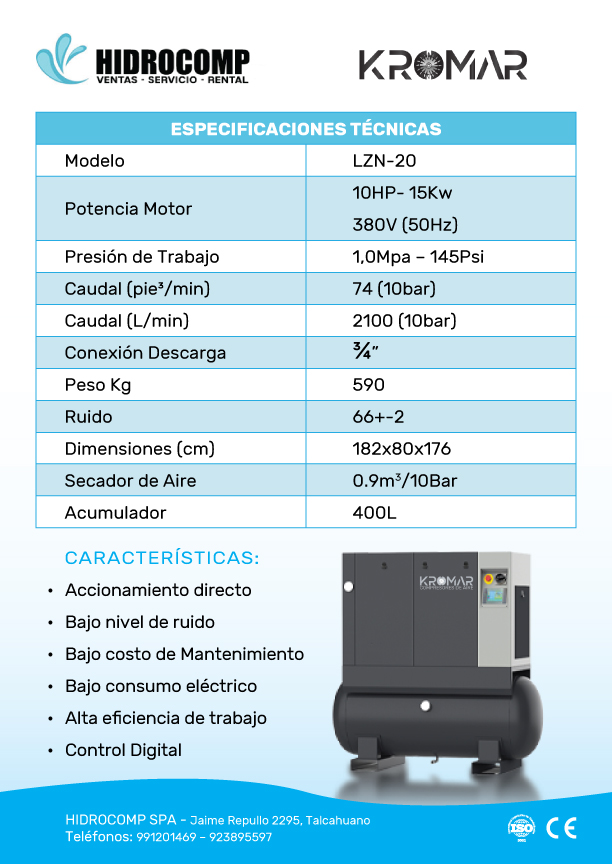 COMPRESOR DE TORNILLO SILENCIOSO 20HP C/ESTANQUE ACUMULADOR 500L